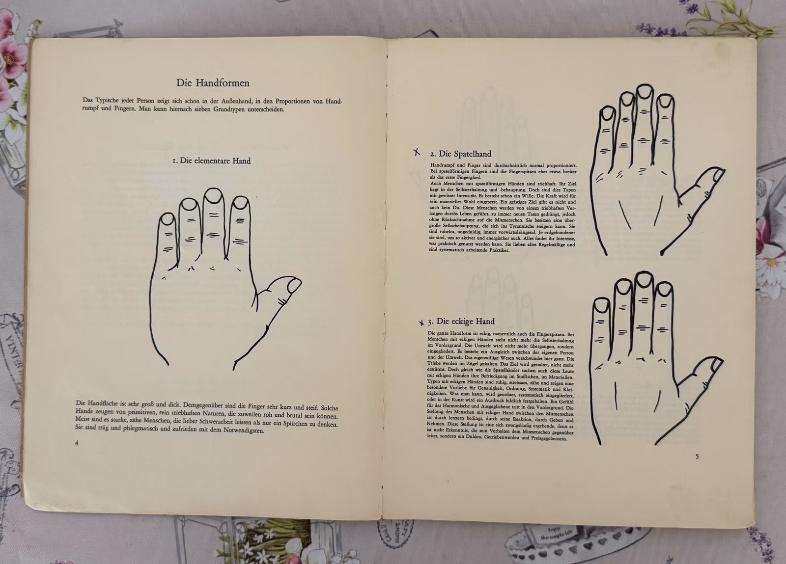Buch/Heft zur Handlesekunst („SCHICKSAL ZUKUNFT – Handlesekunst“) sowie eine offene Buchseite mit Zeichnungen verschiedener Handformen. Land, Jahr, Nominale und Stempelangaben sind nicht erkennbar, da es sich nicht um postalische Marken handelt.