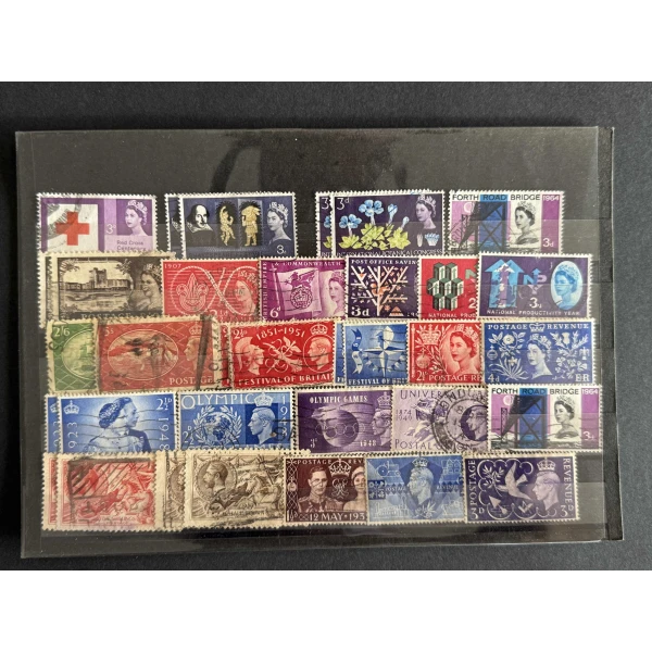 Konvolut britischer Sondermarken (u.a. Rotes Kreuz, British Empire & Commonwealth, National Productivity Year, Festival of Britain, Olympische Spiele 1948, UPU, Forth Road Bridge), Nominale meist 2½d–6d, überwiegend Königin Elizabeth II, teils gestempelt mit Daten um 1950–1964 („12 MAY 19–“, „MAY 1953“).