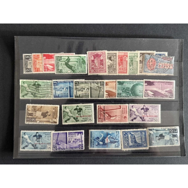 Mehrere italienische Sondermarken „Campionati Mondiali di Calcio“ mit Fußballmotiven (Spieler, Tor, Stadion), teils „Poste Italiane“, teils „Poste Coloniali Italiane“/„Isole Italiane dell’Egeo“. Nominale 5–75 Centesimi und 2,50–5 Lire, inkl. Expresswert. Kein klar lesbares Stempeldatum oder -ort erkennbar.