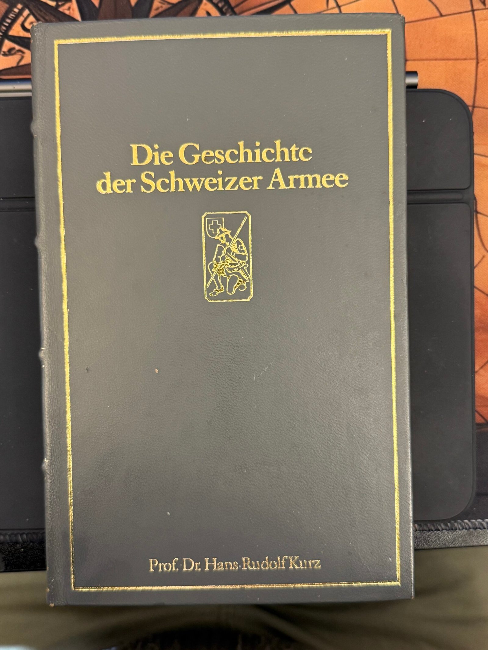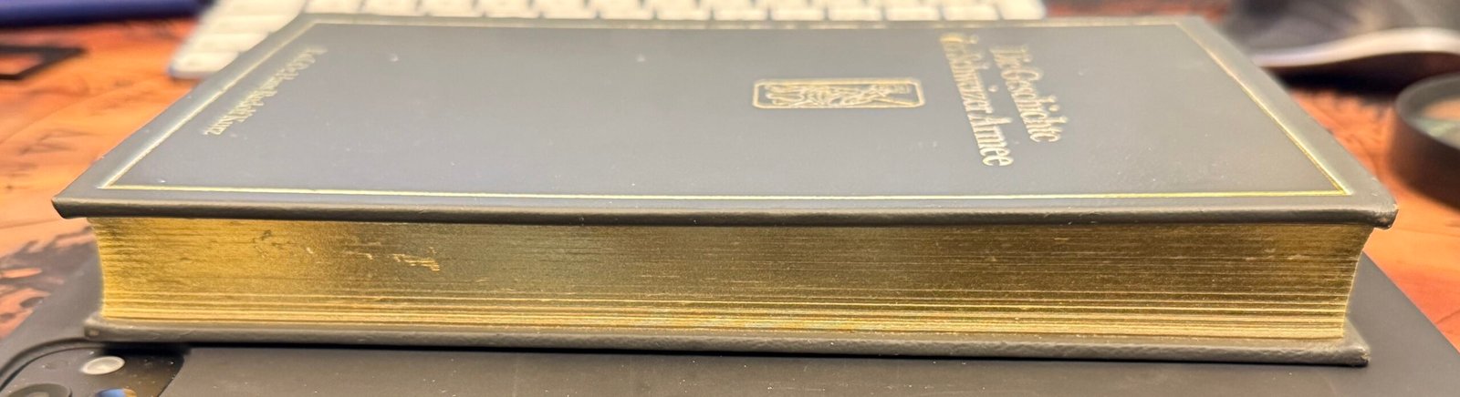Auf den Bildern ist keine Briefmarke erkennbar, sondern ein Buch mit dem Titel „Die Geschichte der Schweizer Armee“ (dunkelblauer Einband, Goldschnitt). Es sind weder Motiv, Land, Jahr, Nominale noch Stempel mit Datum oder Ort einer Briefmarke sichtbar.