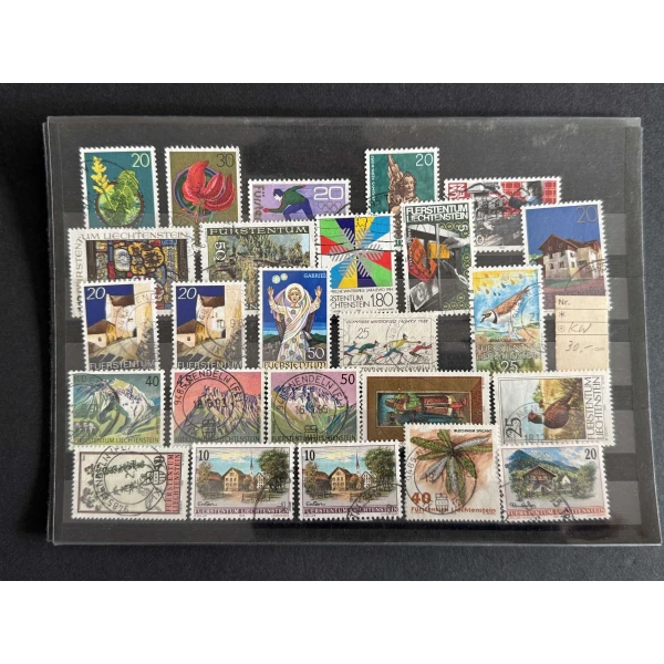 Konvolut liechtensteinischer Briefmarken (Fürstentum Liechtenstein) mit Motiven wie Blumen, Landschaften, Gebäuden, Tieren und Kunst, teils Olympia Winterspiele 1984/1988. Nennwerte u.a. 10, 20, 25, 30, 40, 50, 1.80. Gestempelt u.a. „Nendeln“ und „Eschen“, Daten z.B. 16.4.1975, 18.10.93.