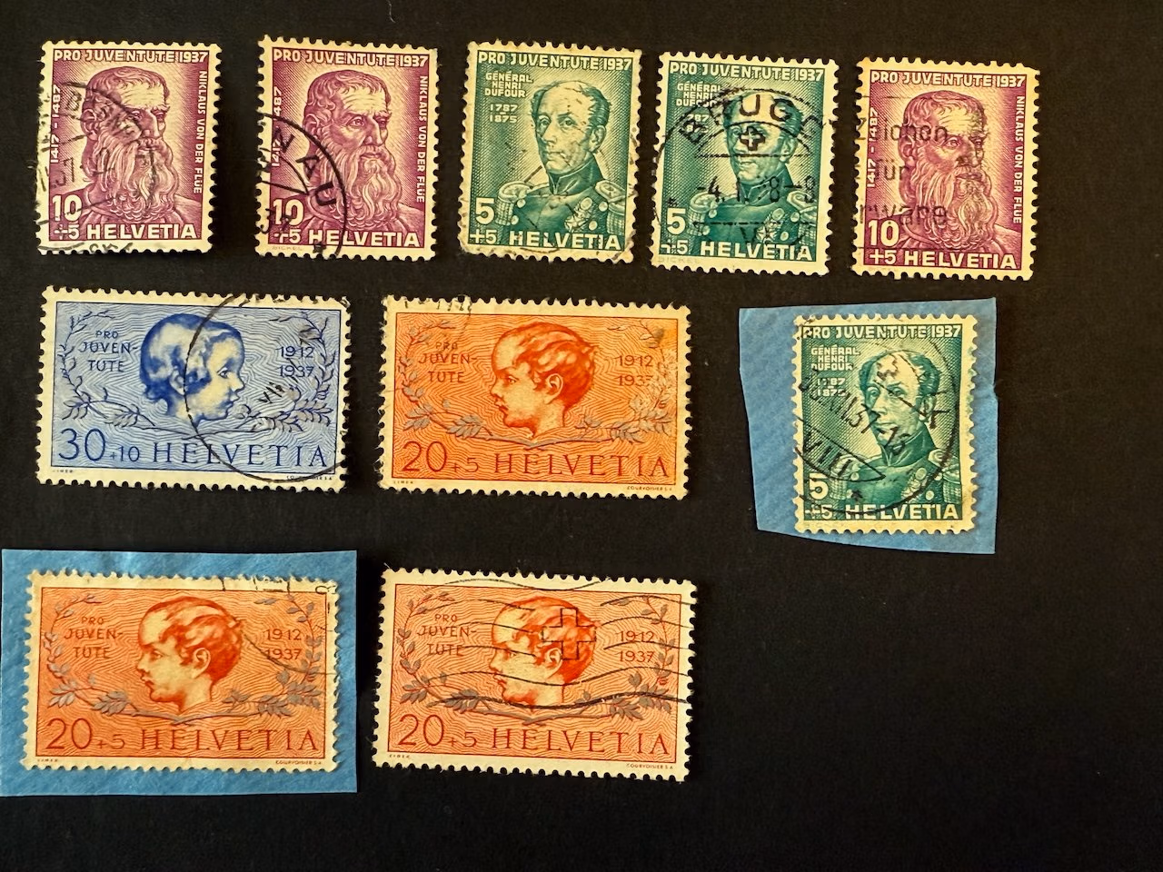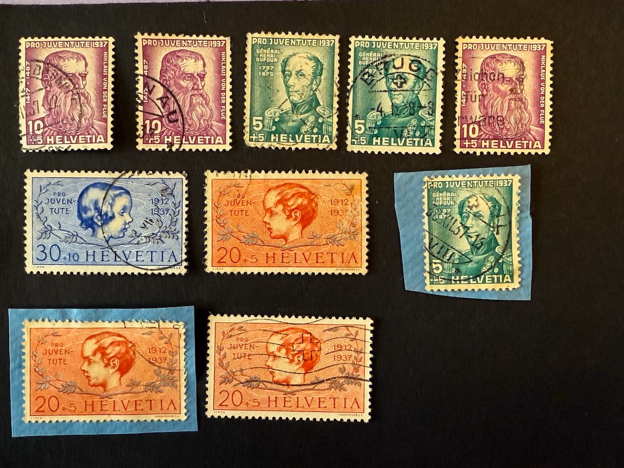 Stichwörter: Schweiz, Pro Juventute, Helvetia, 1912, 1937, Wohlfahrtsmarken, gestempelt, Satz, General Dufour, Porträt, Kindermotiv, 5 Rappen, 10+5 Rappen, 20+5 Rappen, 30+10 Rappen