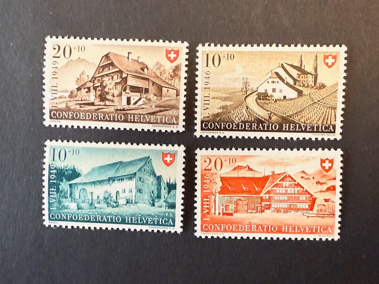 Vier Schweizer Wohlfahrtsmarken „Confoederatio Helvetica“ mit Bauernhaus‑Motiven (u.a. Luzern, Basel). Nennwerte 10+10 Rp und 20+10 Rp. Datiert 1.VIII.1946 bzw. 1.VIII.1949. Keine Stempel sichtbar, postfrische Erhaltung mit Originalgummi.