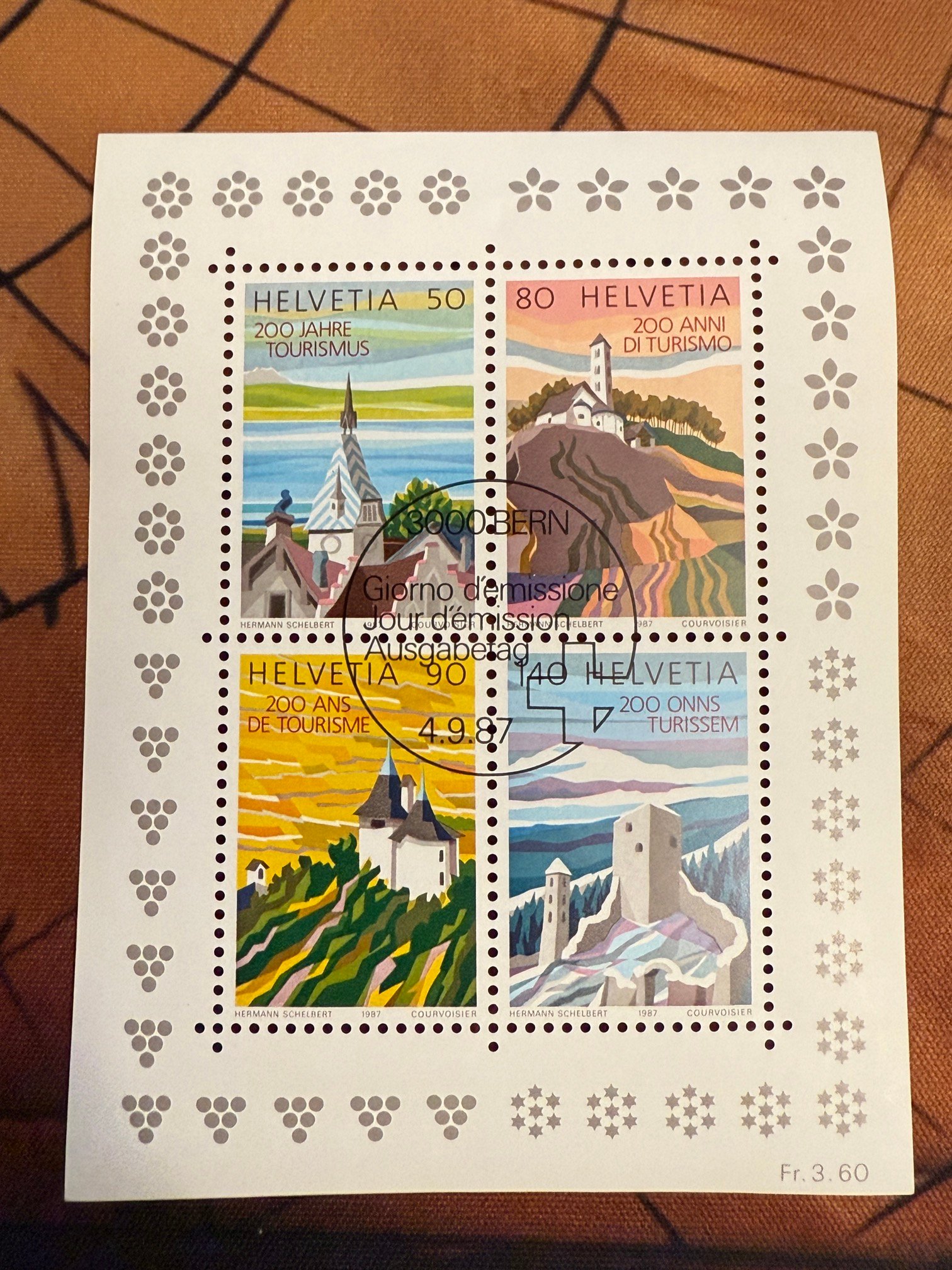 Schweizer Briefmarkenblock „Helvetia“ von 1987 zum Thema „200 Jahre Tourismus“ mit vier Marken (Nominale 50, 80, 90 und 140 Helvetia, Gesamtwert 3.60 Fr.) mit Landschafts- und Kirchenmotiven. Ersttagsstempel 3000 Bern vom 4.9.87, „Giorno d’emissione / Jour d’émission / Ausgabetag“. Rückseite: leerer, nur gezähnter Markenbogen.