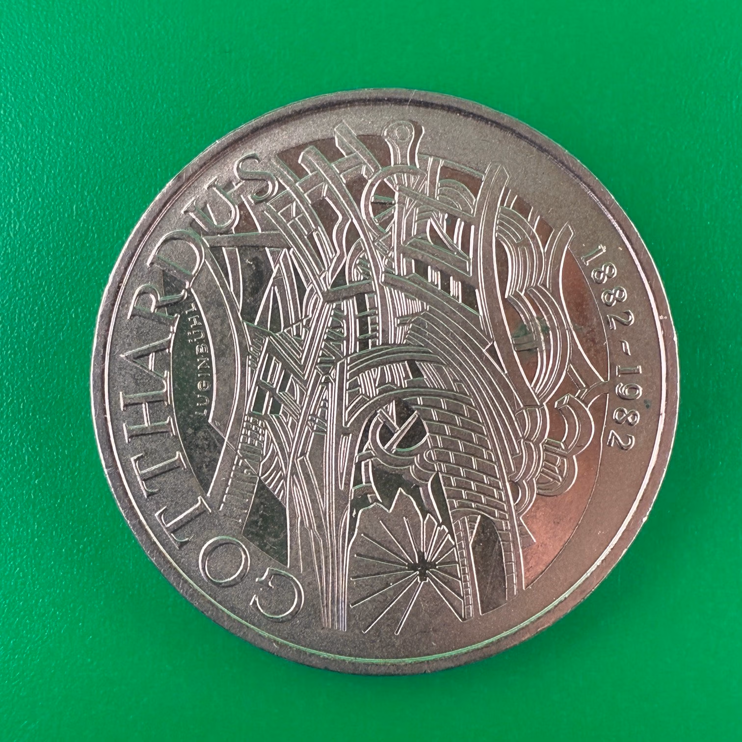2) Gedenkmünze „GOTTHARDUS“ mit abstraktem Linienmotiv, Jahreszahlen 1882–1982, Nennwert/Land im Bildausschnitt nicht erkennbar, kein Stempel.