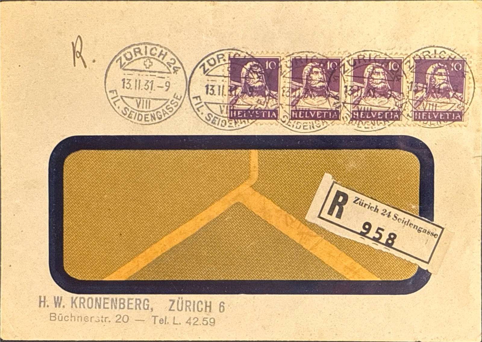 Historischer Einschreibebrief mit klassischer Helvetia-Frankatur Schweiz 1931 – Mehrfachfrankatur Helvetia 10 Rp. auf R-Brief Zürich/Bülach.