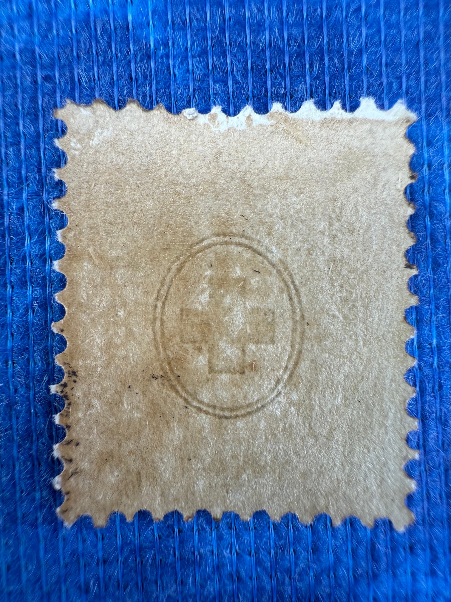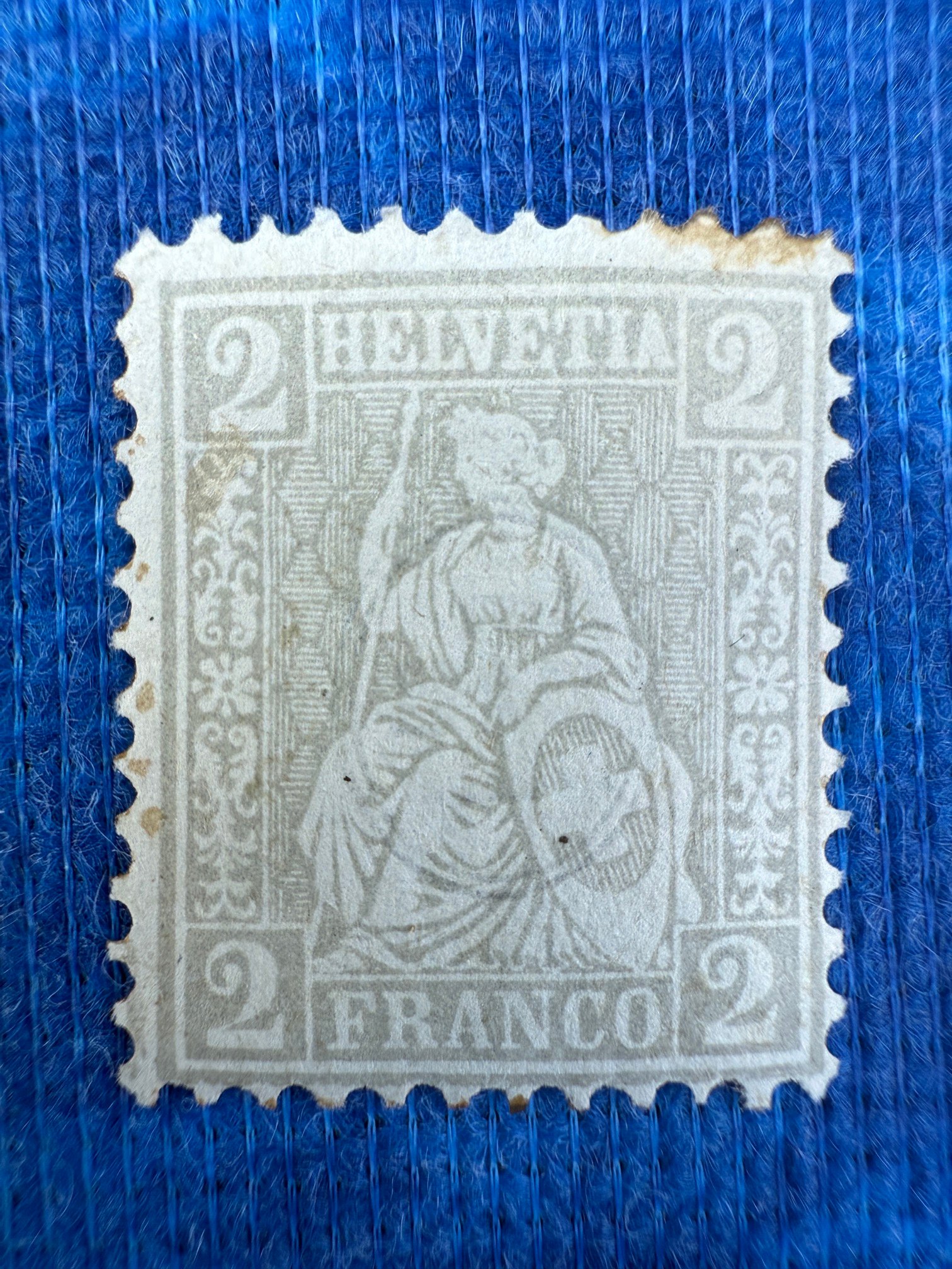 Beschreibung: Klassische graue Schweizer Briefmarke mit sitzender Helvetia und Nominale 2 Franco in allen vier Ecken, Aufschrift „HELVETIA“ oben und „FRANCO“ unten. Gezähnt, leicht fleckig, ohne sichtbaren Stempel, Rückseite mit rundem Kreuz-Wasserzeichen.