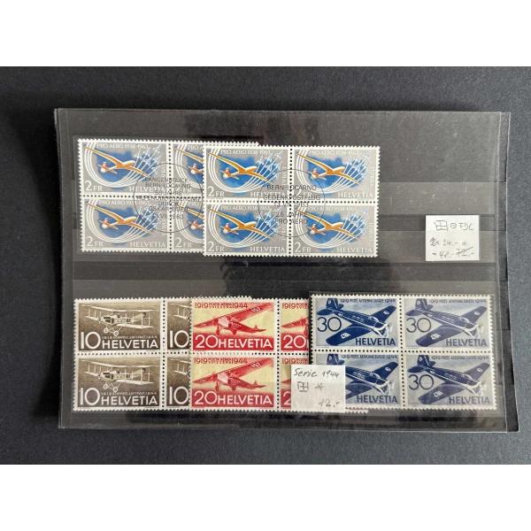 Schweizer Flugpost-Briefmarken: oben 2 Fr „PRO AERO 1938–1963“ HELVETIA mit Flugzeug-Motiv, gestempelt „LANGENBRUCK / BERN–LOCARNO / 13.VII.63“ (Oskar-Bider-Gedenkflug). Unten Serie „1919–1944“ mit Flugzeugmotiven zu 10, 20 und 30 Rp HELVETIA, ungestempelt sichtbar.