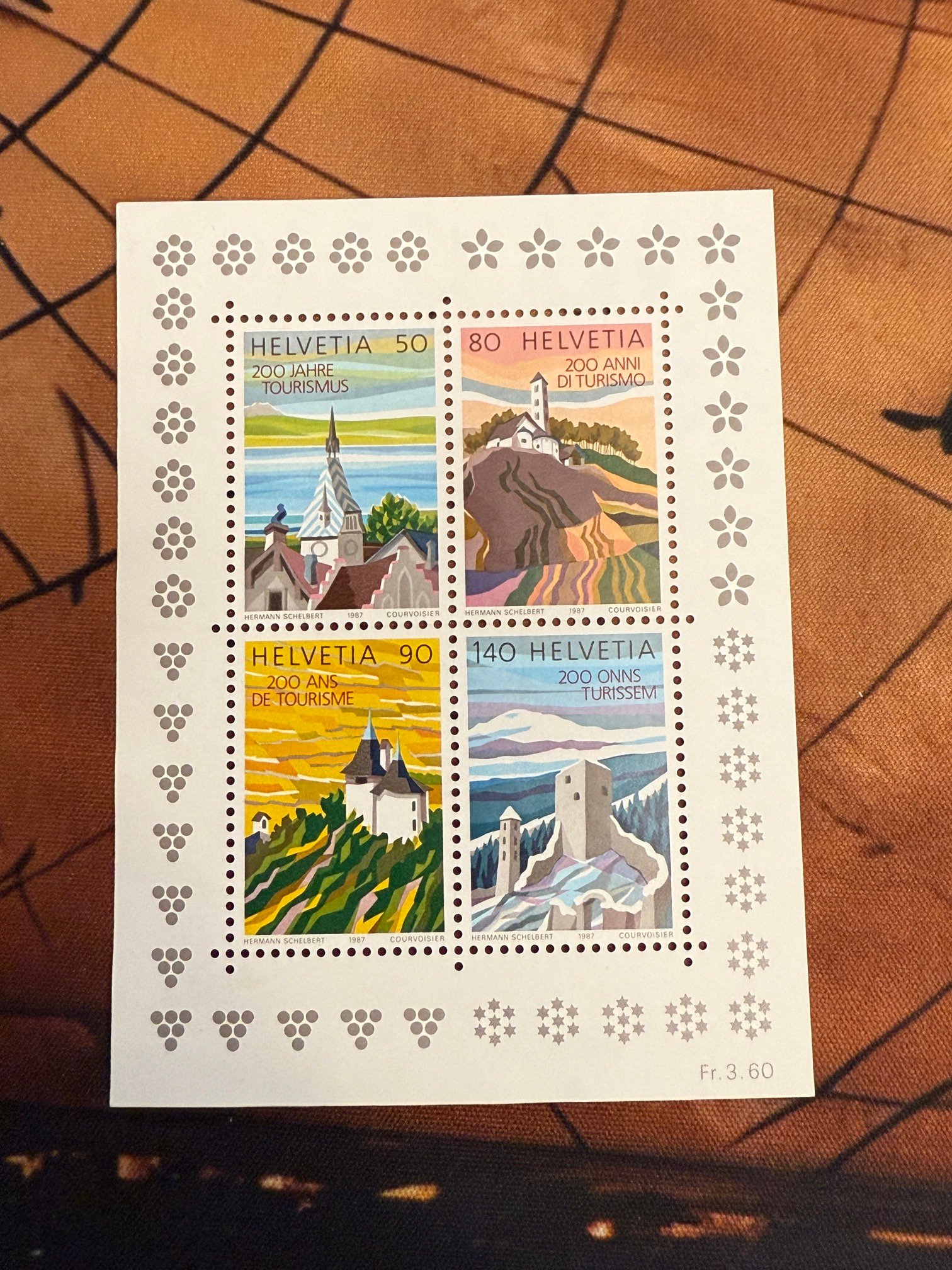 Schweizer Block „HELVETIA – 200 Jahre Tourismus“ (1987) mit vier Landschafts-/Kirchenmotiven. Nominale: 50, 80, 90 und 140 Rappen, Gesamtwert 3.60 Fr. Postfrischer Block ohne sichtbaren Stempel, kein Datum oder Ort erkennbar. Rückseite zeigt leeres Markenbogenteil mit Raster.