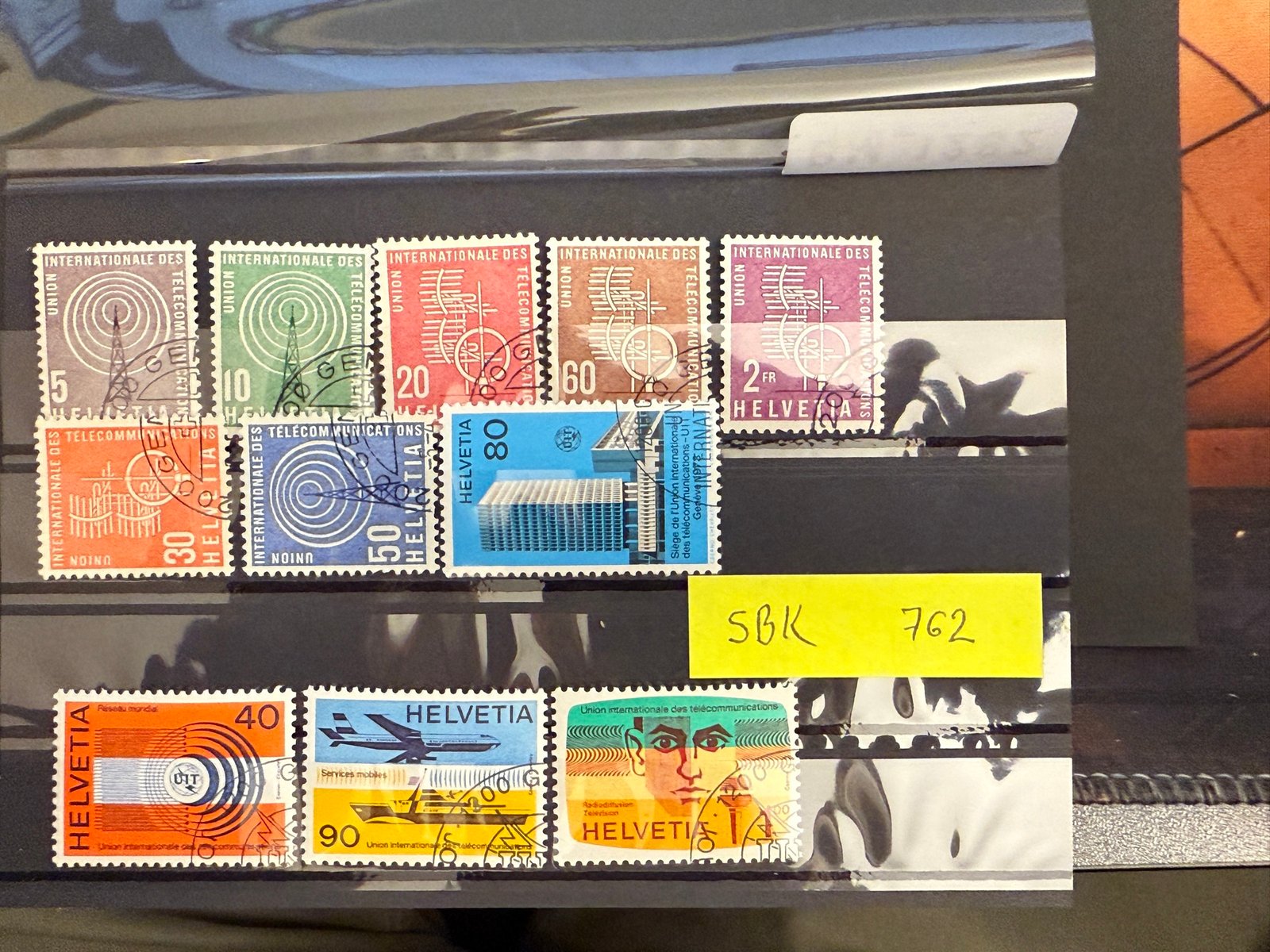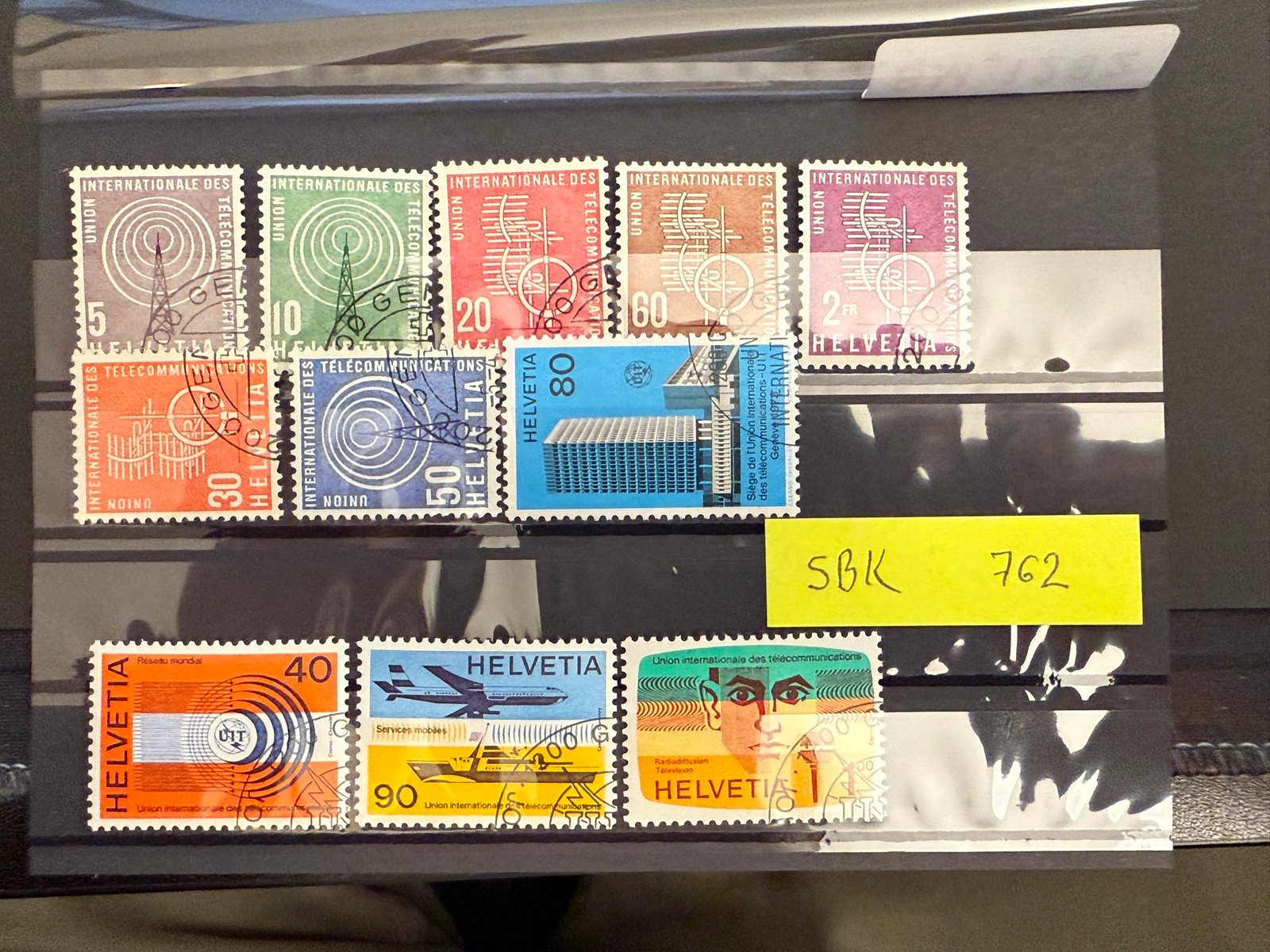 Schweizer Briefmarkenserie „HELVETIA“ zur Internationalen Fernmeldeunion/Telekommunikation mit Motiven wie Funkwellen, Antennen, Gebäude, Flugzeug, Kopf/Medien. Nominale 5–90 Rp und bis 2 Fr. Gestempelt, u.a. mit Ortsstempeln „GENÈVE“ und „ZÜRICH“, Datum z.B. 1.VI.64 (1960er‑Jahre).