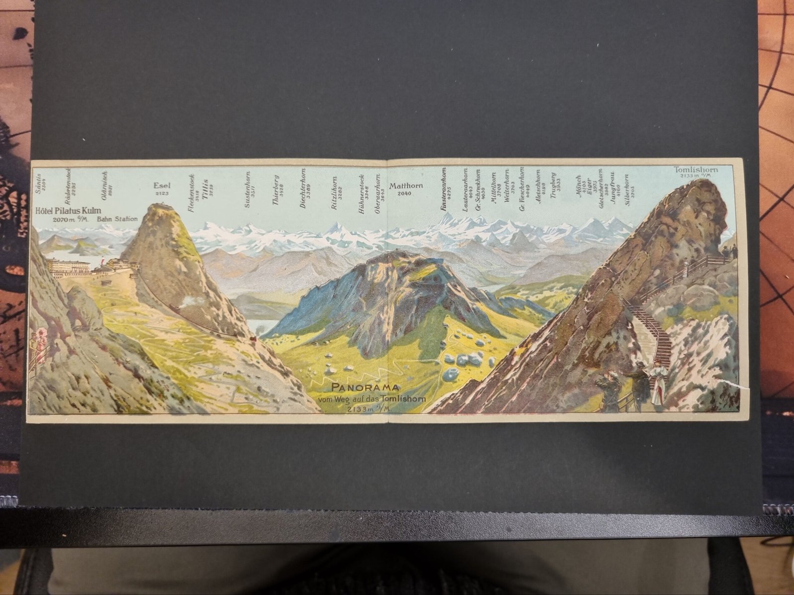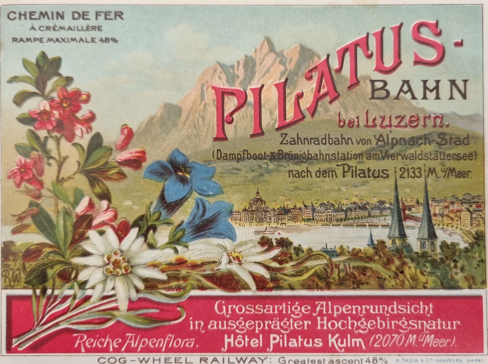 Reklame-Vignette und Panorama-Briefmarke/Postkarte zur Pilatusbahn/Tomlishorn, Schweiz. Motive: Pilatus mit Vierwaldstättersee, Alpenblumen, Hotel Pilatus Kulm und beschriftete Gipfel. Keine Jahresangabe, keine Nominale erkennbar, kein lesbarer Stempel (weder Datum noch Ort sichtbar).