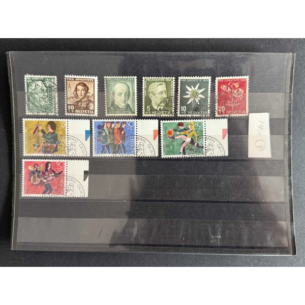 Konvolut Schweizer Pro-Juventute-Briefmarken: oben Porträts/Naturmotive 1942–1944, Werte 5, 10, 20 Rp + Zuschlag „HELVETIA“/„+5“. Unten Serie Pro Juventute 1990 mit Kinder- und Sportmotiven, Nominale 35, 50, 80, 90 Rp + Zuschlag „+20/40“. Mehrere Marken gestempelt „BERN 0.11.90 PRO JUVENTUTE 1990“.