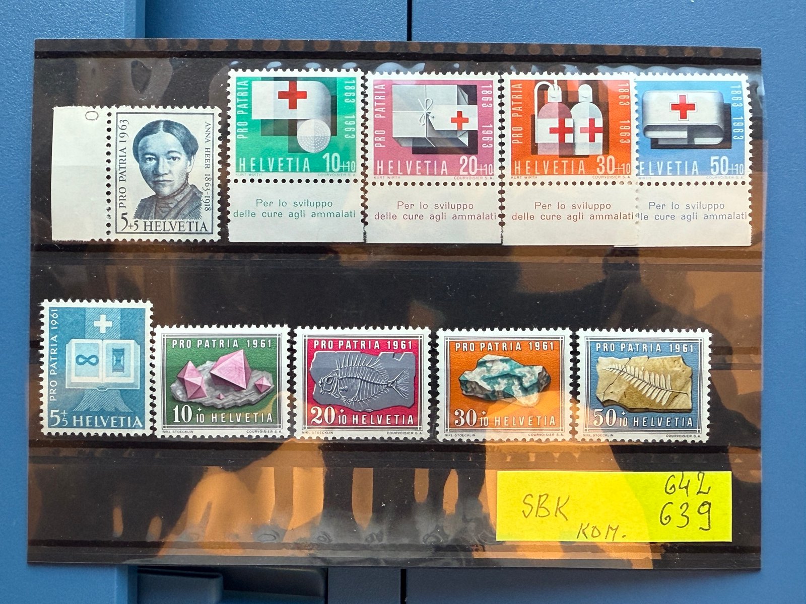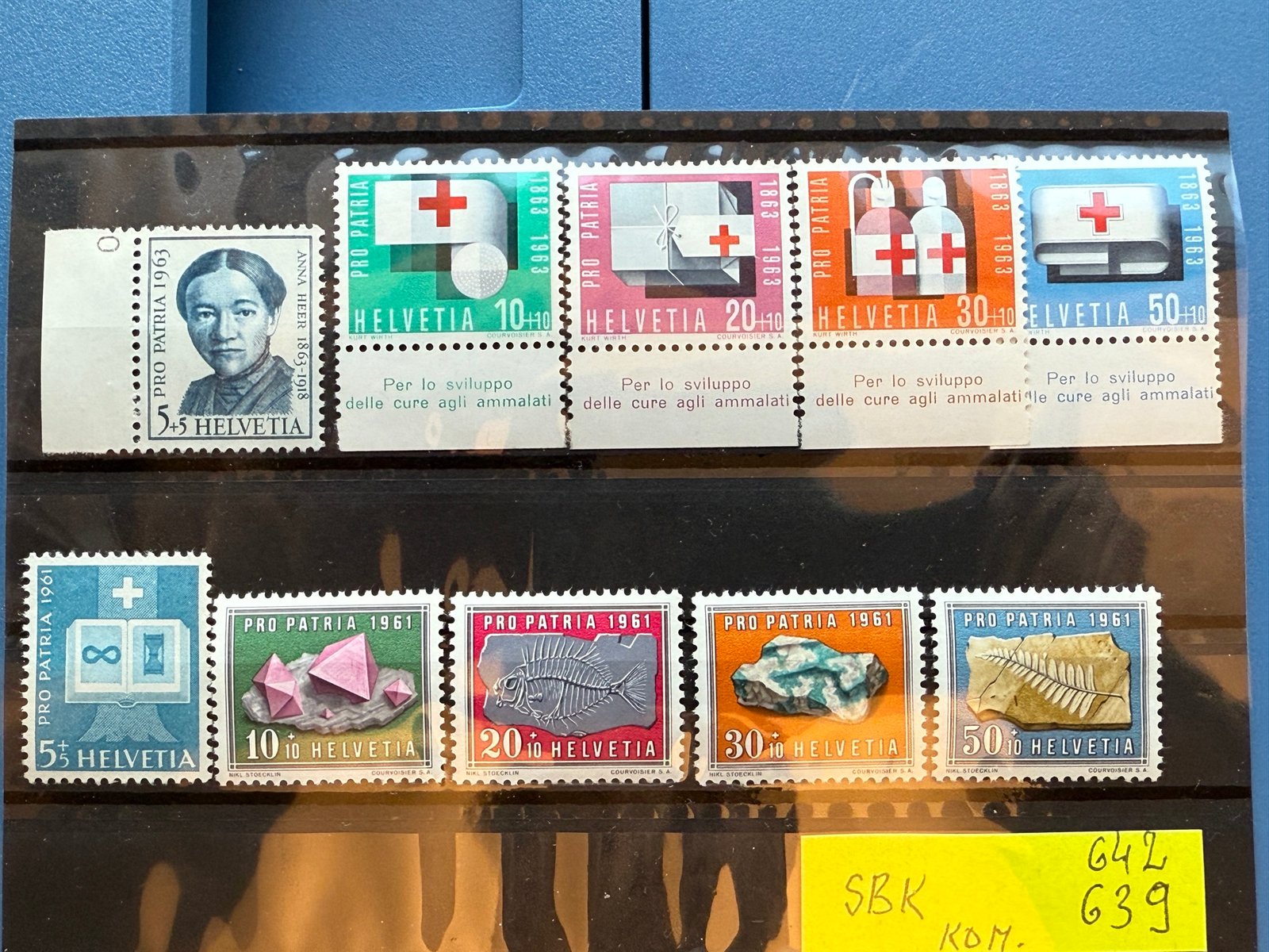 Schweiz, Pro Patria‑Wohltätigkeitsmarken: oben Serie 1963 „Per lo sviluppo delle cure agli ammalati“, u.a. Porträt Anna Heer (5+5 Rp) und vier Rotkreuz‑Motive (10+10, 20+10, 30+10, 50+10 Rp). Unten Serie 1961 mit Kreuz‑Symbol, Kristallen, Fossilien (5+5 bis 50+10 Rp). Keine Stempel sichtbar.