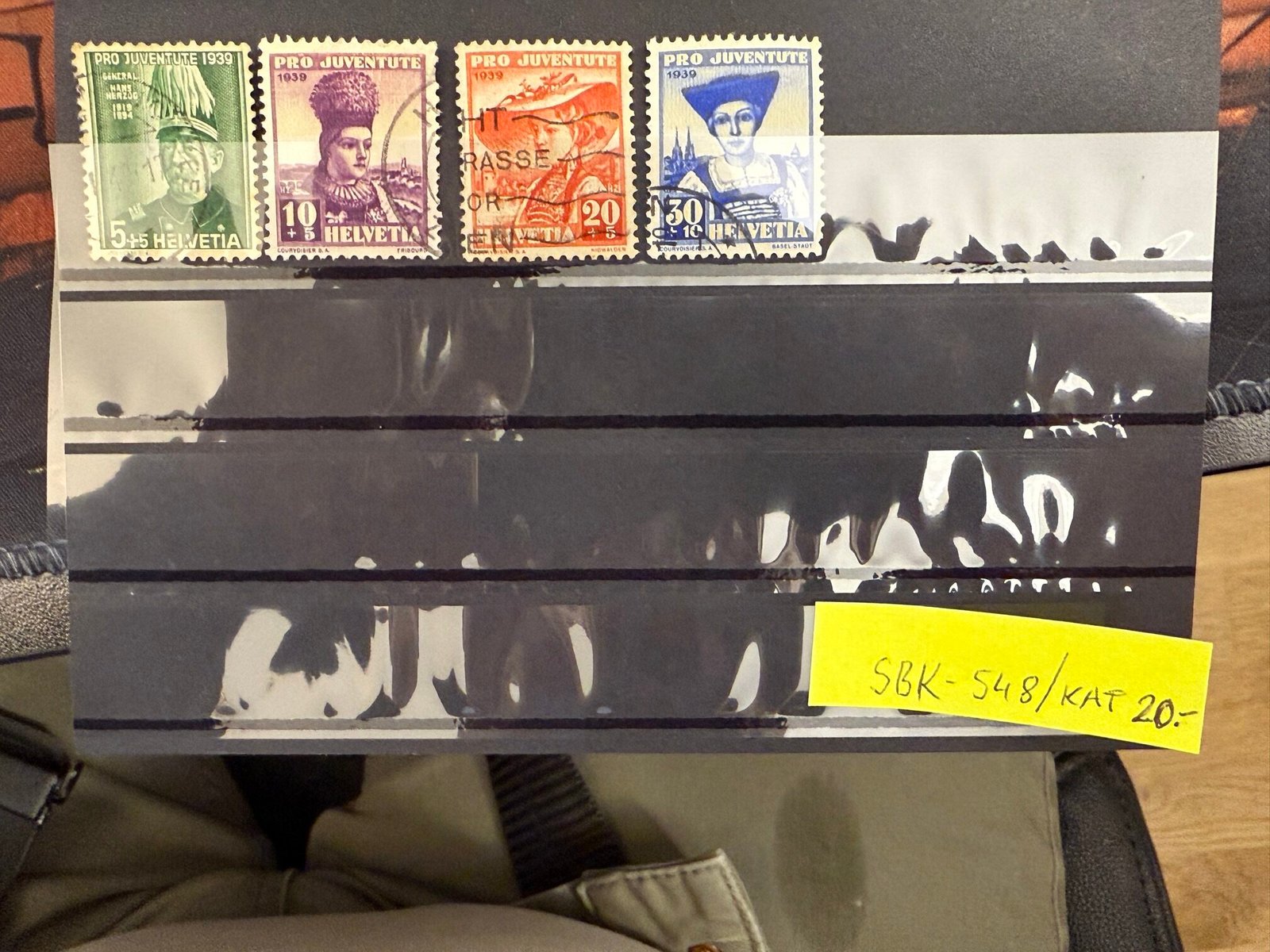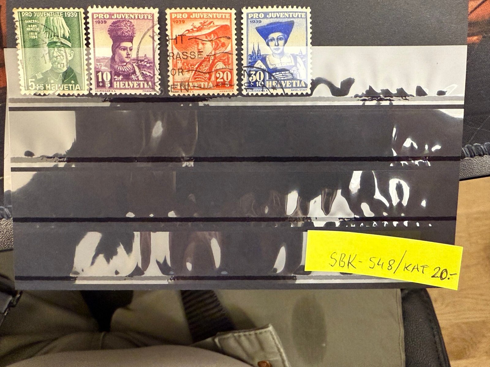 Vier Schweizer Pro-Juventute-Briefmarken 1939 „HELVETIA“ mit Porträts in Tracht, Nominalen 5+5, 10+5, 20+5/20+10 und 30+10 Rappen. Teilweise gestempelt; bei einer Marke ist ein Stempel mit Fragmenten wie „RASSE“/„OR“ erkennbar, Datum jedoch nicht eindeutig lesbar.