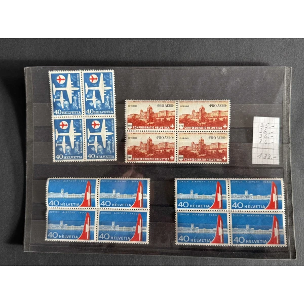 3) Mehrere Viererblöcke Zürich Airport 1953, Flughafen, 40 Rp HELVETIA, ungestempelt.