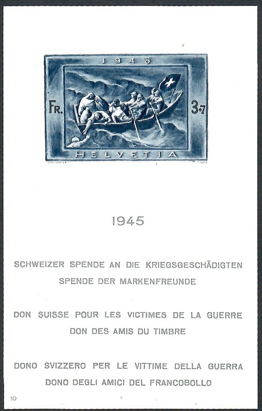 Schweizer Wohlfahrtsmarke „Helvetia“ von 1945 mit Ruderboot‑Motiv und Schweizer Flagge, Nominale 3+7 Franken (3 Fr. Porto + 7 Fr. Zuschlag „Schweizer Spende an die Kriegsgeschädigten / Spende der Markenfreunde“). Ungestempelt, daher kein Datum oder Ort erkennbar.