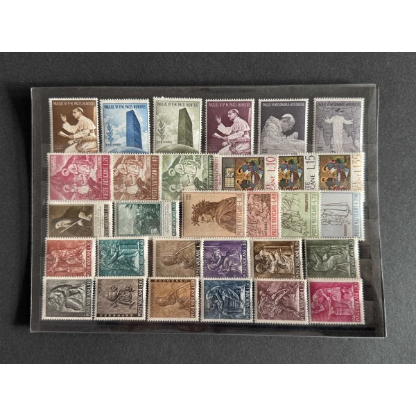 Mehrere ungestempelte Briefmarken des Vatikanstaats, teils Serien „PAULUS VI P.M. PACIS NUNTIUS“ und „PAULUS VI MISSIONARIUS APOSTOLICUS“, Motive u.a. Papst Paul VI., Dante „Inferno/Purgatorio/Paradiso“, „Nativitas“, St. Benedikt. Nominale 5–150 Lire, teils 1.10/1.35; Jahresangaben MCMLXIV/MCMLXV. Keine Stempel.